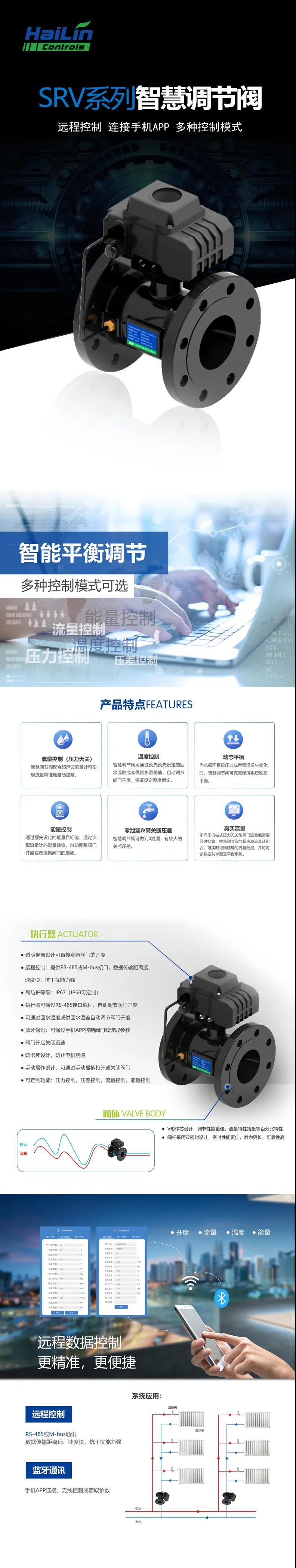 海林SRV系列智慧調節閥采用RS-485 或 M-Bus通訊,實現遠程控制;與手機APP連接,實現無線控制,手機讀取參數;多種控制模式可選(包括流量控制、溫度控制、能量控壓力控制、壓差控制等);同時可預設控制參數,自動調節監控。