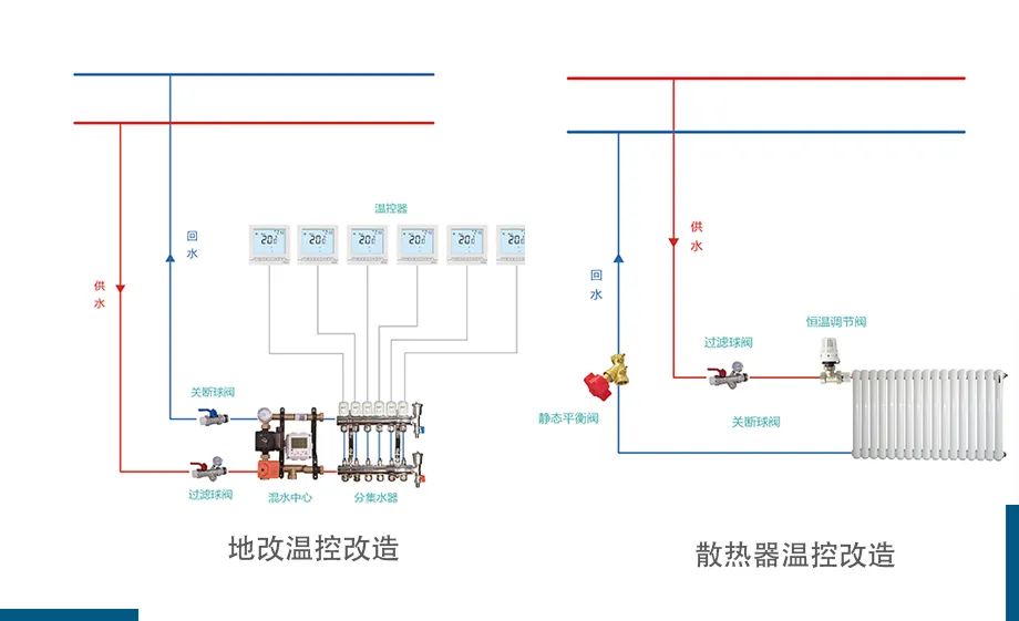 地暖溫控改造:在分室采暖控溫系統方案上,加裝混水控制中心,將高溫水混合降溫,延長地暖管材使用壽命,改變原來的供熱不均、供熱質量差的情況,實現房間內恒溫,提升居住舒適度。