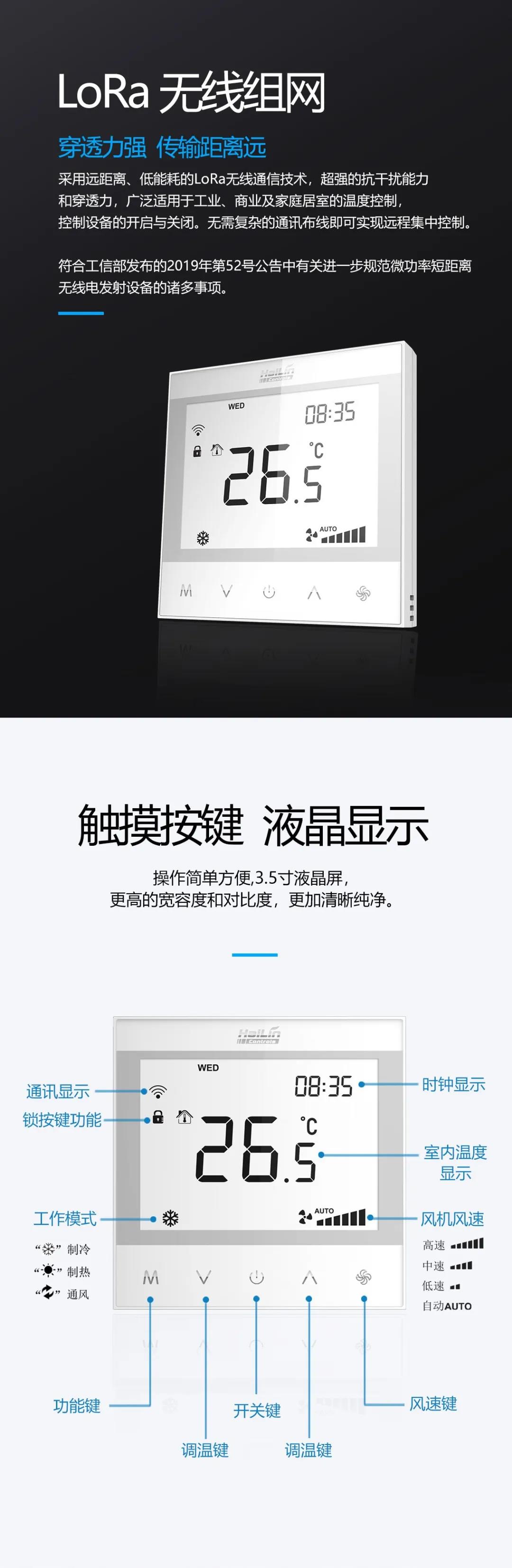 HL7031無線LoRa溫控器,為用戶提供準(zhǔn)確環(huán)境數(shù)據(jù)顯示,實時調(diào)控室內(nèi)溫度,觸摸按鍵,液晶顯示,操作簡單方便。